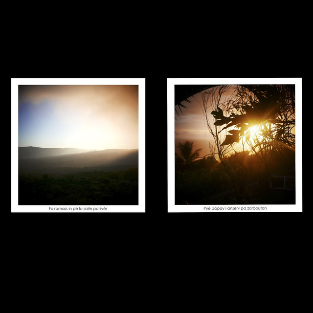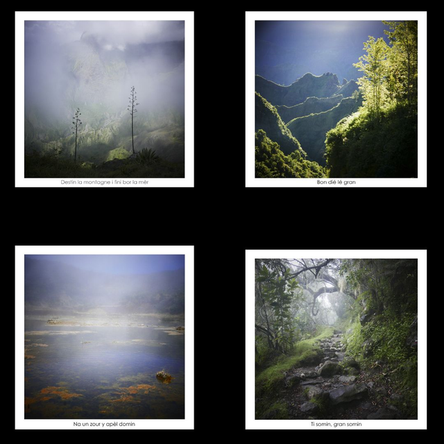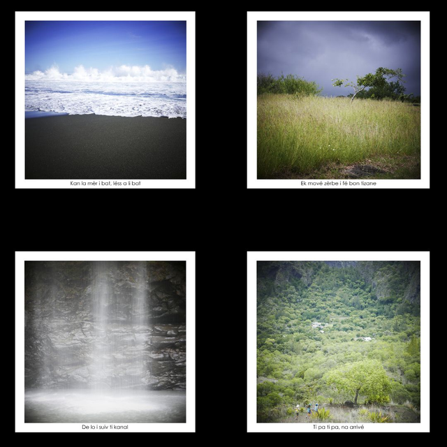 Photos prises entre 2017 et 2025 à la Réunion, boitier Lumix Panasonix LX 100 II, série de photos soulignées de proverbes en créole. Impression sur papier de création.