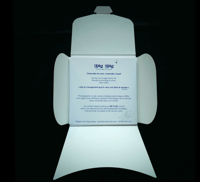 L’idée est de chatouiller les sens (vue, toucher, réflexion) avec un concept initial de 10 cartes postales dans un coffret, faites localement avec le label Imprim’vert.